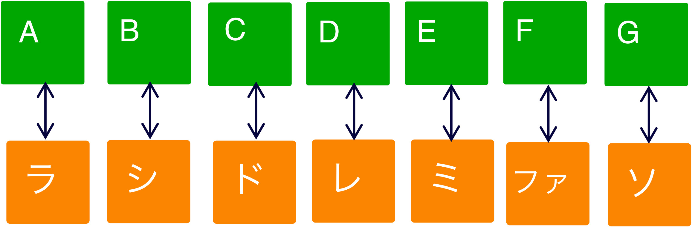 まずはこの7つの対応を覚え、「F」と見たら「ファ」、「G」と見たら「ソ」を左手で弾けるようにしましょう。