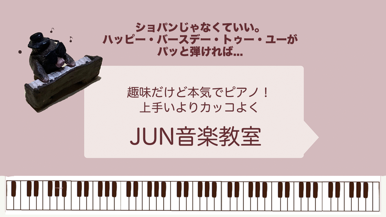 JUN音楽教室は、生徒さんに長く通っていただくことを目的としていません。 コードの仕組みとアレンジのコツを身につければ、どんな曲でも自分の力で弾けるようになります。「自立してピアノを楽しめる力」を手にいれるお手伝いをすること、それが私(JUN)の願いです。レッスンを卒業した後も、一生、音楽をピアノを自由に楽しめる。そんな仲間を増やすことが私の願いです。